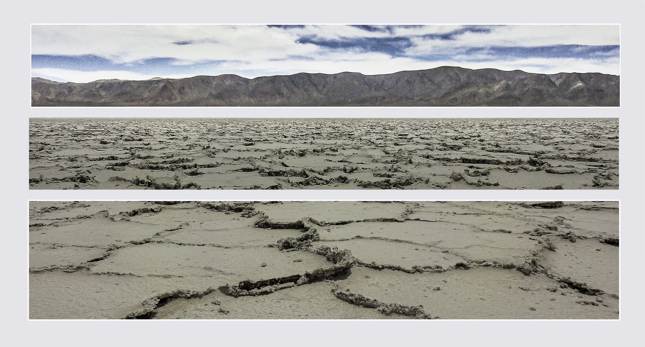 Texture has always fascinated me and the salt crust provides interesting variations. The triptych format is something I’ve always liked and felt appropriate for these “big” landscapes, highlighting the texture and scale in separate segments.